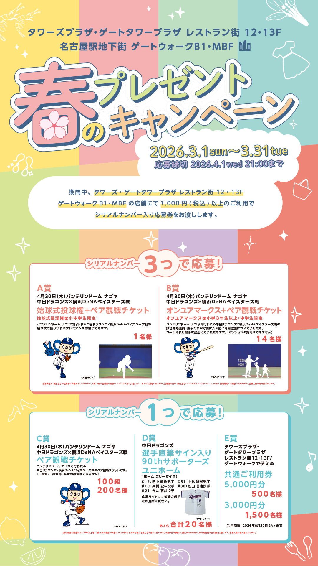 ご応募いただいた方の中から抽選で、プロ野球の観戦チケットや対象店舗で使える共通ご利用券などが当たります。春のお買い物やお食事とあわせて、ぜひご応募ください♪